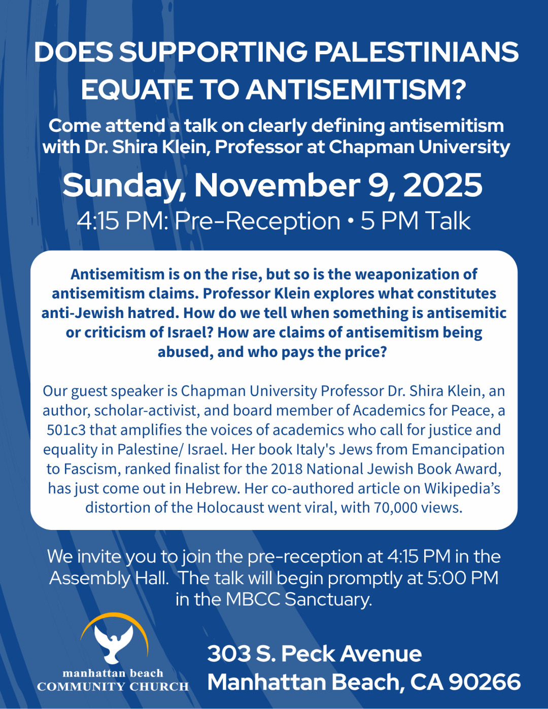 BIBLE FELLOWSHIP – In person or on zoom, in the Youth Room just off the back parking lot. We are using a study guide that brings the Bible alive today. We will be exploring today’s news through Bible verses of hope as a tool to persevere and navigate our daily lives in Christian faith.For more information contact Becky Tan, 310-529-9400, or email rjtab39@gmail.com