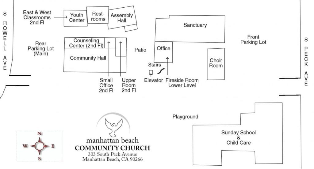 Many of our church members use also address 325 S. Peck Ave to park in the MBUSD office building parking lot. There is a stairwell taking you from their parking lot to our church campus.